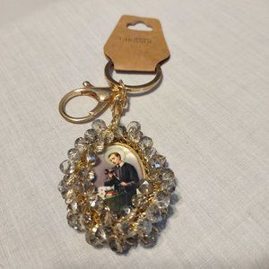 Keychain is decorated with stones. Has the Virgen on one side and St. Gerardo on the other side.