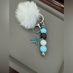 Handmade with silicone beads, light blue cross, & Pom Pom.