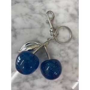 This is a glitter cherry bag charm or keychain/bag charm. This accessory features two blue, glitter-filled resin cherries on a metal stem and leaves.