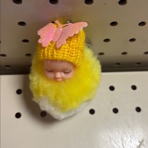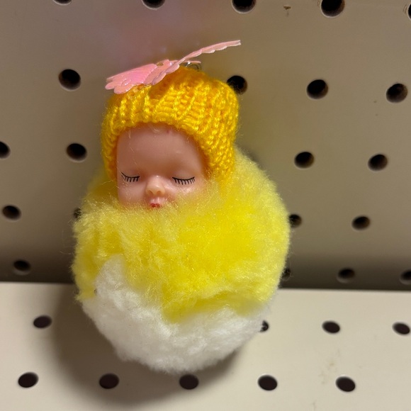Adorable baby doll toy with a soft yellow and white design. Perfect for imaginative play and cuddling.
