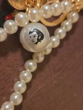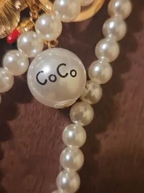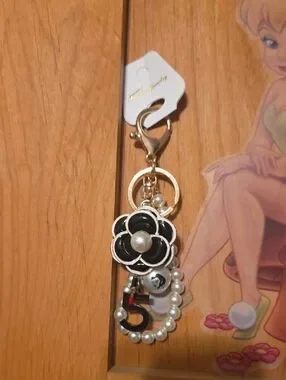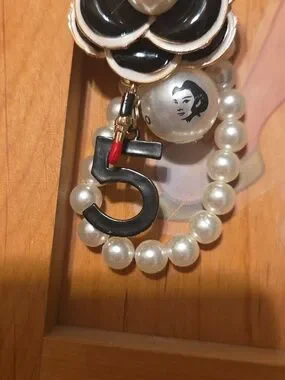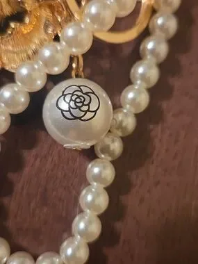 This item is a handmade Chanel-inspired camellia flower bag charm and keychain featuring faux pearls, a number five charm, and a "CoCo" branded pearl charm