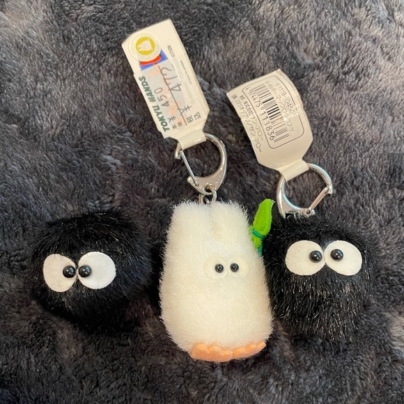 My Neighbor Totoro keychains and pin. The two black ones are dust bunnies, one is the pin and the other is the keychain. The white one is a mini Totoro. All have never been used!