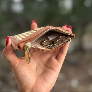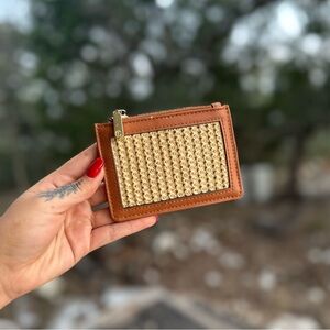 Tan faux leather and wicker material wallet with keychain ring to attach to your keys. Clear ID slot and 3 others. Zippered compartment for coins.