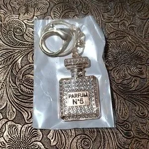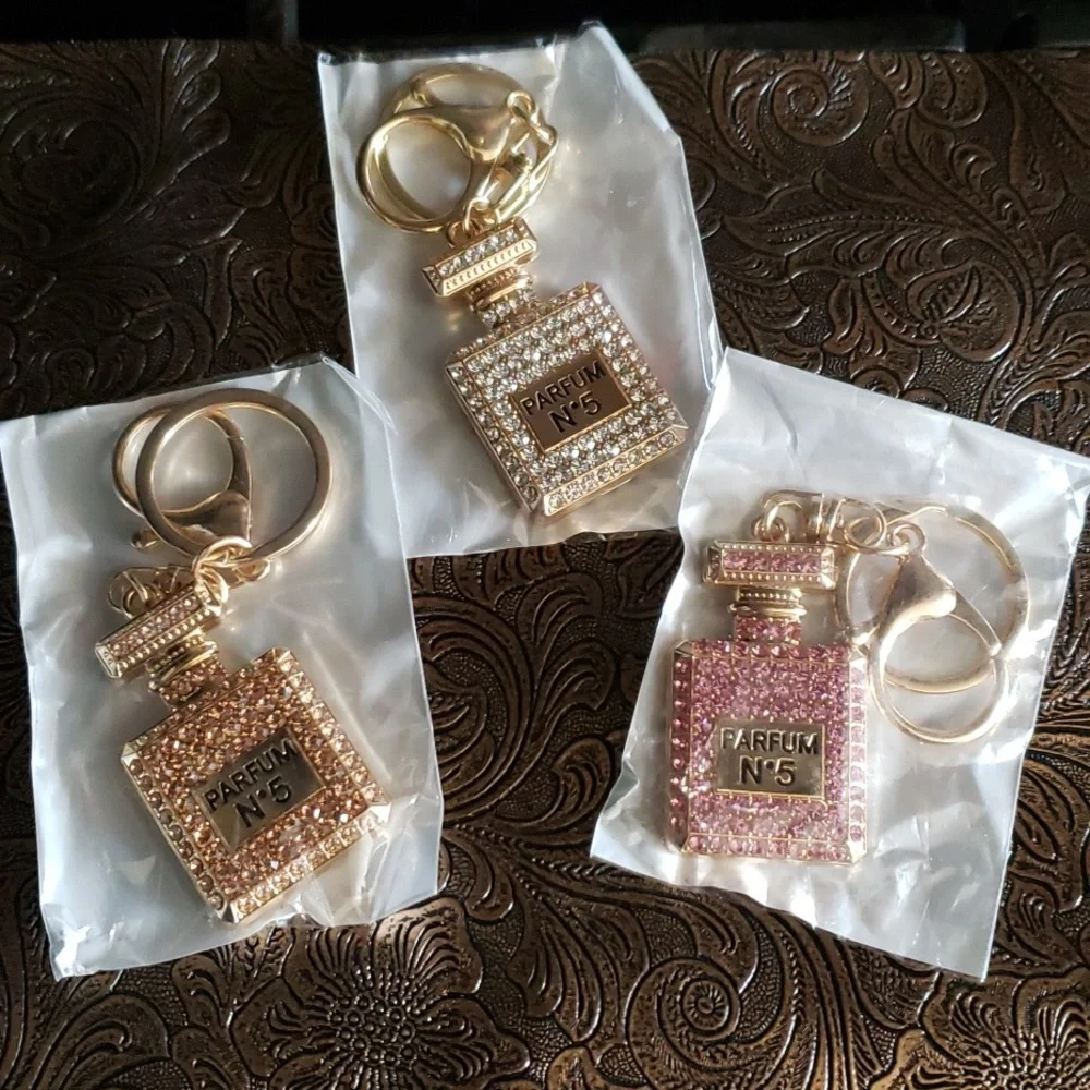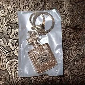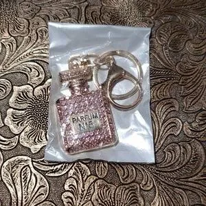 Brand new, novelty keychain that mimics perfume bottles. Gold with a variety of rhinestone color choices. Pink, white or yellow/gold rhinestones are all available. All 3 for $25 or $10 a piece. Great to hang from your bag or purse.