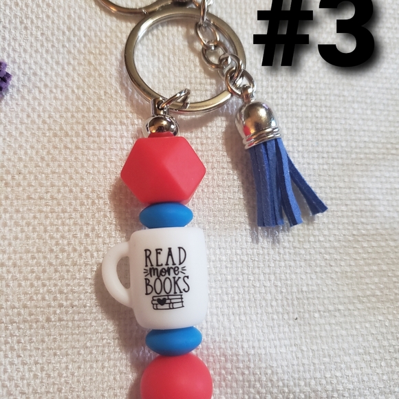 Heavy Duty silver keychains with a hook. Beaded by hand with silicone beads and charms with a small tassle.