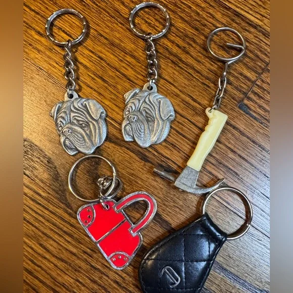 Set of unique keychains featuring dog faces, a red bag, and a tool. Perfect for adding character to your keys.