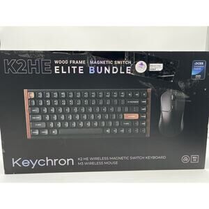 The Keychron K2 HE Keyboard and M3 Lite Mouse Wood Frame Wireless Elite Bundle is a premium set of wireless mechanical keyboards and mice featuring a sleek black design with a wooden frame. The Keychron K2 HE keyboard is a high-end model with a QWERTY layout, making it a top choice for those seeking a reliable and stylish keyboard for their computing needs. The bundle also includes the M3 Lite mouse, known for its ergonomic design and precise control. Perfect for anyone looking for a high-quality wireless keyboard and mouse setup.
