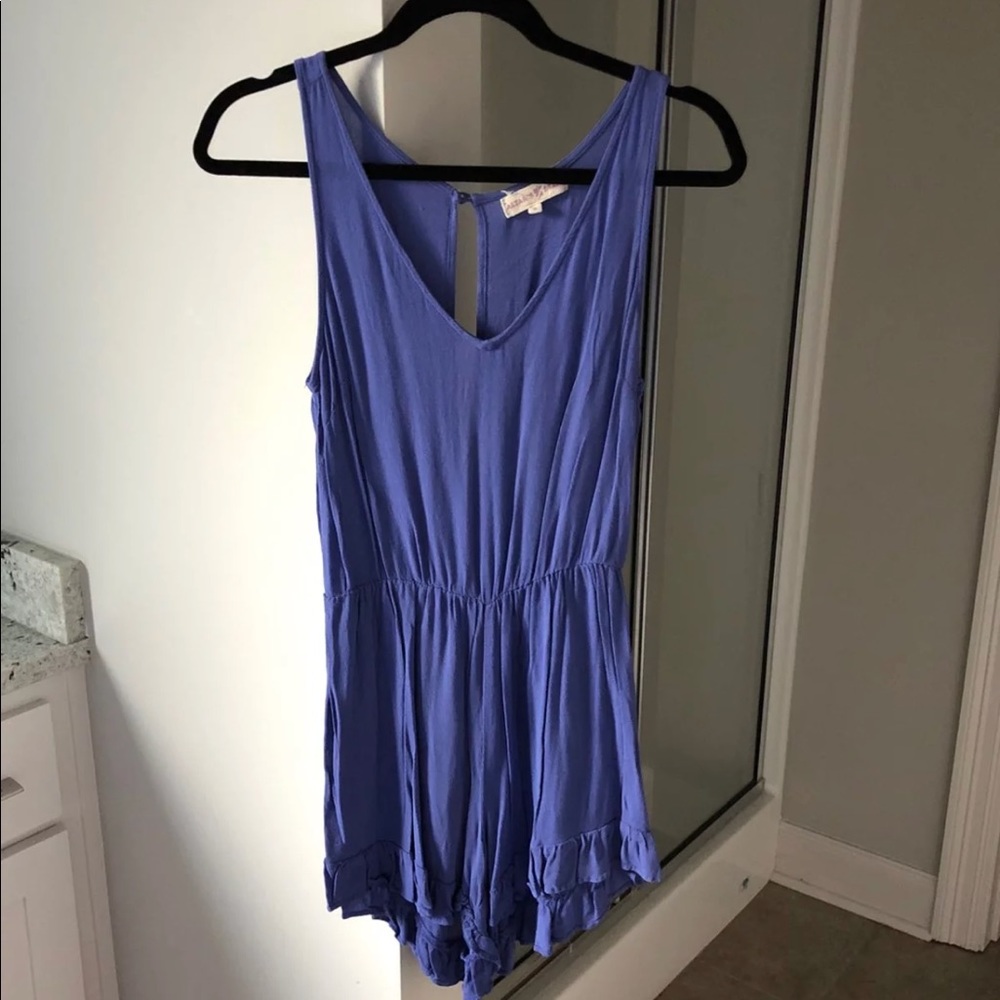 Periwinkle blue romper. Frill details around the short bottoms, slight cinching detail to accent waist with a key hole, semi open back. Lightweight and beautiful in the summertime!