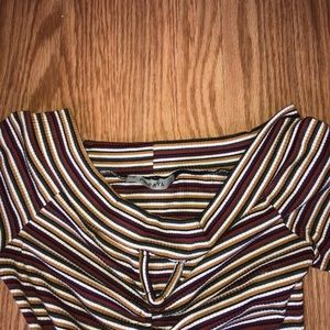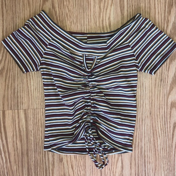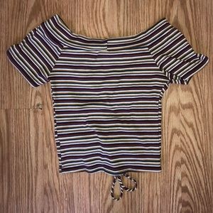 Off the shoulder striped crop t-shirt, with cute keyhole cutout. Ties at bottom can be used to adjust crop level!