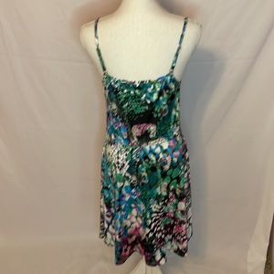 Multicolor patterned summer tank dress. Keyhole under bust. Twisted knot in center of chest.