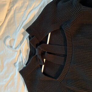 Bought this at Macys but there is no tag. This is different and fun! Has a back cutout with a bow tie. Can be worn with jeans but can easily go with black pants for the club or out to eat or a party!!