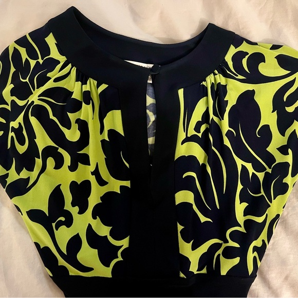 Flattering fit with navy and green patterned midi dress.