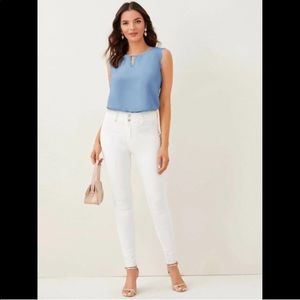 Woven sleeveless top featuring a round neckline, scalloped trim on sleeves, and a bust keyhole. This would work well for a business casual look with a blazer and dress pant, or just a casual day out shopping or dinner and a movie.