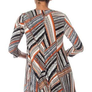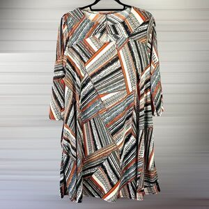 Keyhole Detail Geometric Pattern Swing Dress. Side pockets. Very soft. Sleeves are a bit longer than 3/4 length. Hits above the knee.  Style with tall boots, western boots and black leggings or a great pair of sandals.