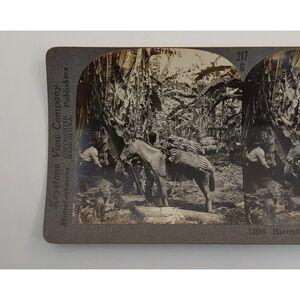 This Keystone View card features a fascinating image of harvesting bananas in Costa Rica. The black and white photograph has a scalloped edge and was produced using albumen print technique in 1902. The vintage stereoview and stereoscope type card is made from cardboard and paper materials.