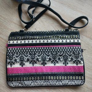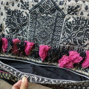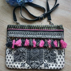 Khaadi Bag Boho Embroidered Tassel Crossbody Fabric Leather Trim-Strap Black Pink