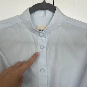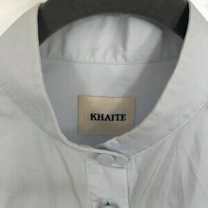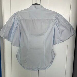 Good condition light blue Khaite Doma top with exaggerated sleeves. Not ideal for larger just (DD+). Has a peach discoloration on the upper placket (see last photo).