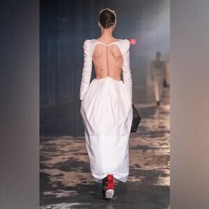 This statement-making dress reveals the sculptural side of cotton twill with its long-sleeve bodice featuring allover ruching and a voluminous skirt. Side cutouts that extend to the open back-bisected with a string of sparkling Swarovski crystals-bring sultry allure to the distinctive look. Style Name: Khaite Rosaline Ruched Open Back Cotton Twill Dress. Style Number: 6132029.