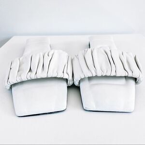 Minimalist square-toe flats crafted of supple leather with a delicate ruched finish. Features white-colored leather upper and sole with a ruched ruffle strap over the vamp, slip on style, square, open toe, made in Italy, and padded insoles.