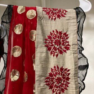 The churidar has embroidery on the top with maroon churidar. The dupatta is very fancy with frilled borders.