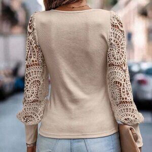 Khaki Boho Womens Contrast Guipure Lace Lantern Sleeve Top