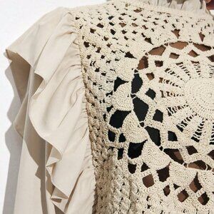Khaki Casual Women's Apricot Hollow Hook Flower Splicing Ruffles Top