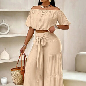 Khaki Casual Women's Beach One-Shoulder Puff-Sleeved Crop Top & Wide Leg Pants