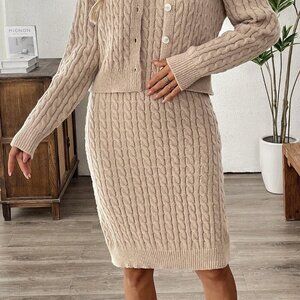 Khaki Casual Women's Button Front Cardigan & Jumper Dress 2-Piece Set