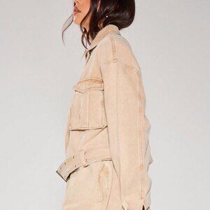 Khaki Casual Women's Collared Pocket Detail Belted Longline Cropped Denim Jacket