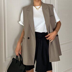 Khaki Casual Women's Double Button Double Pocket Vest Blazer