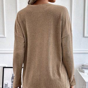 Khaki Casual Womens Half Button Drop Shoulder Waffle Knit Tee