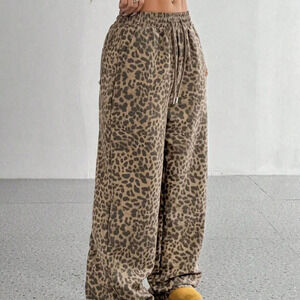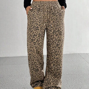 Khaki Casual Women's Leopard Print Loose Wide Leg Palazzo Pants