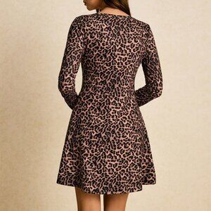 Khaki Casual Women's Leopard Print V Neck Long Sleeve Mini Tie Front Dress