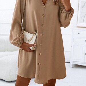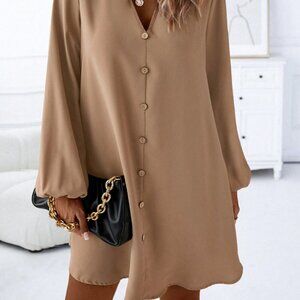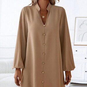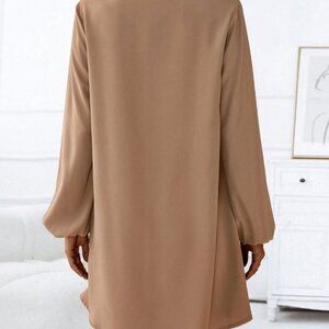 Khaki Casual Women's Notched Neckline Lantern Sleeve Dress