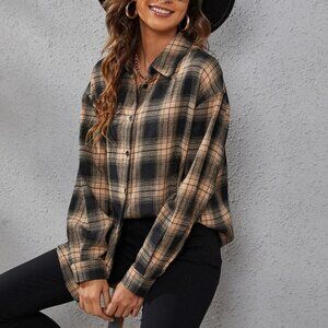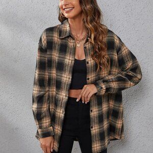 Khaki Casual Womens Plaid Print Drop Shoulder Shirt