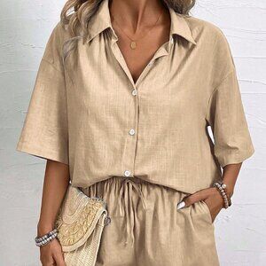 Khaki Casual Women's Solid Button Front Shirt & Drawstring Waist Shorts