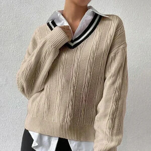 Khaki Casual Women's Striped Trim Drop Shoulder Cable Knit Sweater