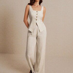 Khaki Casual Women's Summer Linen Color Linen Suit Vest Two-Piece Set