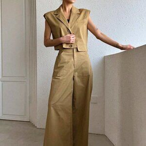 Khaki Casual Women's Turn-Down Collar Batwing Sleeve Top And Wide-Leg Pants Suit