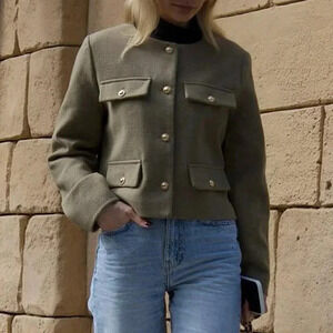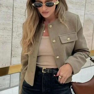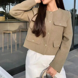 Khaki Casual Women's Tweed Jacket Round Neckline Decorated Long Sleeves Coat
