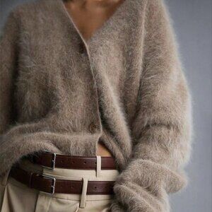 Khaki Casual Women's V-Neck Furry fuzzy button down Sweater cardigan
