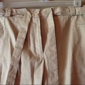 Khaki crop pants with sash tie and zip front. Partial elastic waist band. 98% cotton, 2% spandex. 20" Inseam
