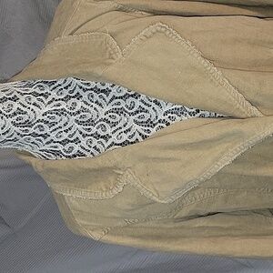 Keywords: khaki jacket, beige blazer, frayed edge jacket, gold accent jacket, casual jacket, boho jacket, neutral jacket, women's jacket, lightweight jacket, spring jacket, fall jacket, distressed jacket, vintage style jacket