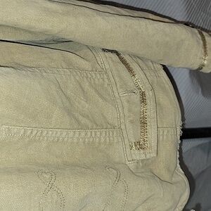 Khaki Jacket Frayed Edges Gold Accents Casual Chic Neutral Tones