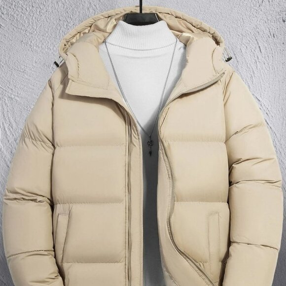 Khaki Casual Mens Drawstring Hooded Zipper Puffer Coat