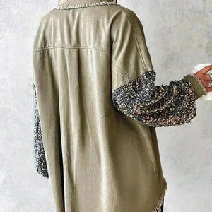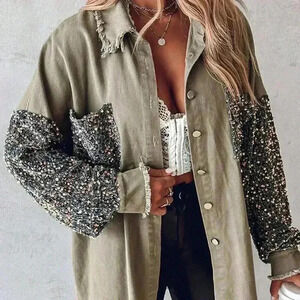 Khaki Party Women's Turn-Down Collar Contrast Sequin Raw Hem Button Down Shacket