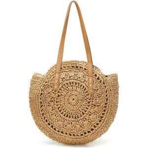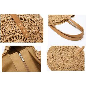 Khaki Straw Bag Round Summer Straw Large Woven Beach Bag Purse For Women