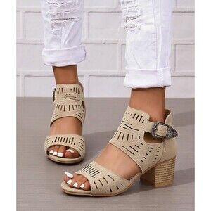 Khaki Tan Peep Shootie Open Toe Perforated Sandals Cutout Block Heels Sz 11 NEW