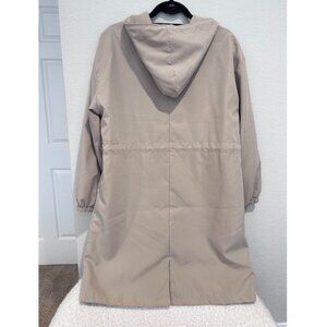 Khaki single-breasted trench coat with drawstring hood, doubles as light raincoat.
