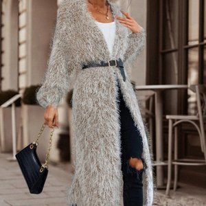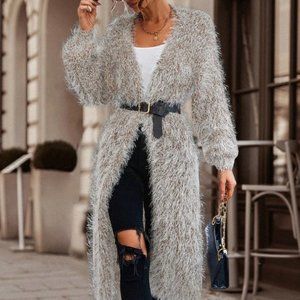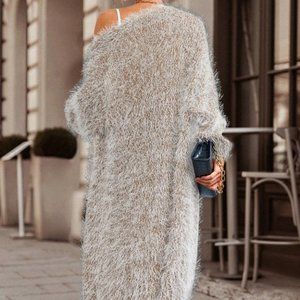 Khaki Preppy Womens Drop Shoulder Open Front Fuzzy Cardigan
